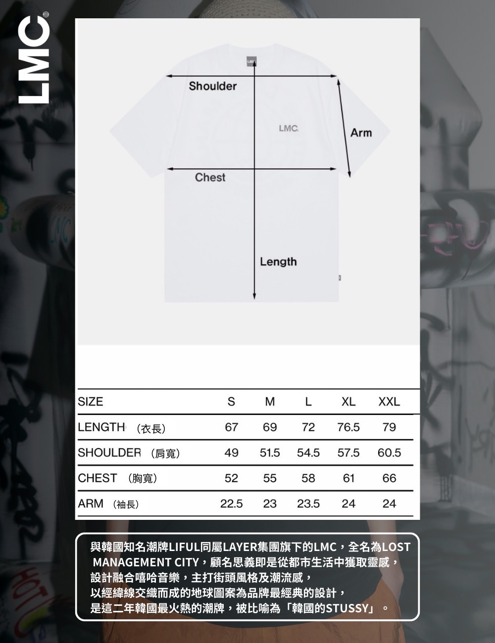 與韓國知名潮牌LIFUL同屬LAYER集團旗下的LMC,全名為LOST MANAGEMENT CITY,顧名思義即是從都市生活中獲取靈感,設計融合嘻哈音樂,主打街頭風格及潮流感,以經緯線交織而成的地球圖案為品牌最經典的設計,是這二年韓國最火熱的潮牌,被比喻為「韓國的STUSSY」。